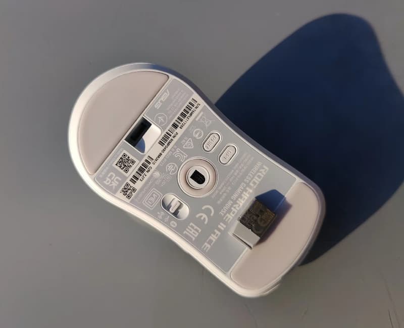 Côté technique, la marque annonce un capteur maison ROG AimPoint Pro montant à 42 000 DPI, un polling rate jusqu’à 8000 Hz en filaire comme en sans fil, une autonomie donnée pour environ 90 heures à 1000 Hz, ainsi qu’une connectique triple avec 2,4 GHz, Bluetooth et USB. La molette est la seule zone éclairée et son RGB sert aussi d’indicateur de batterie, ce qui pour une fois n’est pas juste là pour faire joli. En outre, le dongle se range directement sous la souris, détail tout bête mais franchement malin quand on transporte son matos. Le bundle reste sobre, presque austère, mais il va à l’essentiel : câble USB-A vers USB-C blanc assorti à la souris, patins de rechange, grips, documentation et une rallonge pour rapprocher le dongle avec un petit clip de fixation pensé pour le tapis. Côté lignes, la Harpe II Ace adopte une silhouette très arrondie, un peu moins longue qu’une Viper V3 Pro et moins bombée sur le dessus. Le résultat, de prime abord, respire la maîtrise plus que le folklore marketing. Et ça, mine de rien, ça devient rare.