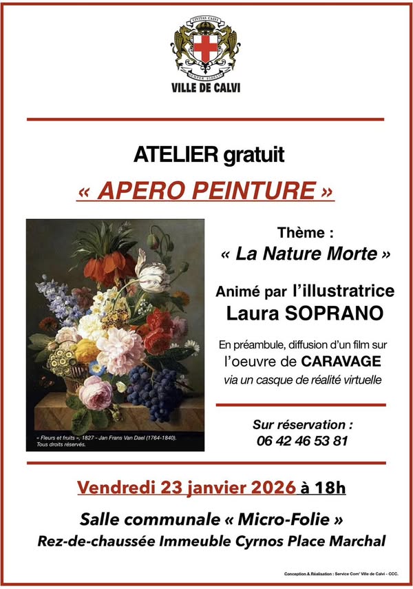 Ce vendredi 23 janvier à 18h, la Micro-Folie accueillera l’illustratrice Laura Soprano pour un atelier intitulé « Apéro Peinture ». Le thème de cet événement sera « La Nature Morte ». En introduction, un film sur l’artiste Le Caravage sera diffusé, mettant en lumière son œuvre emblématique.