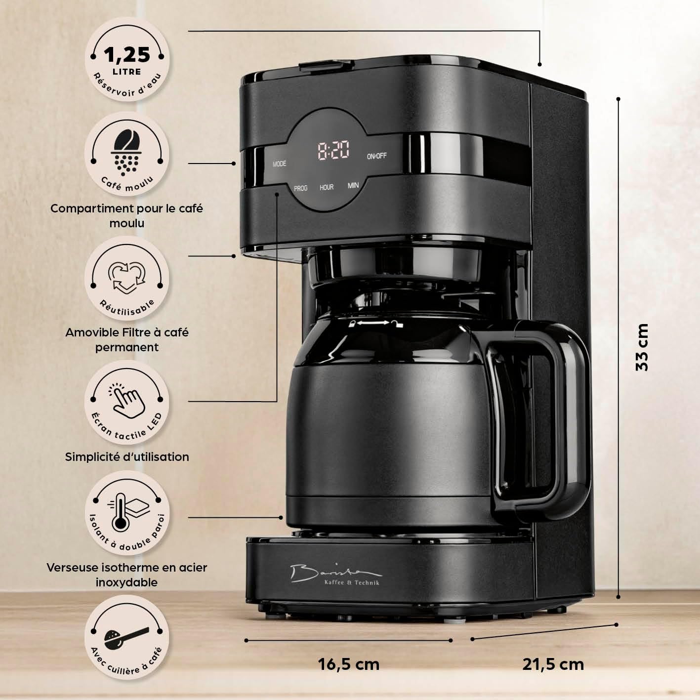 La cafetière Barista est conçue pour ceux qui recherchent un café de qualité sans tracas. Transformez vos matinées en un moment agréable et confortable.