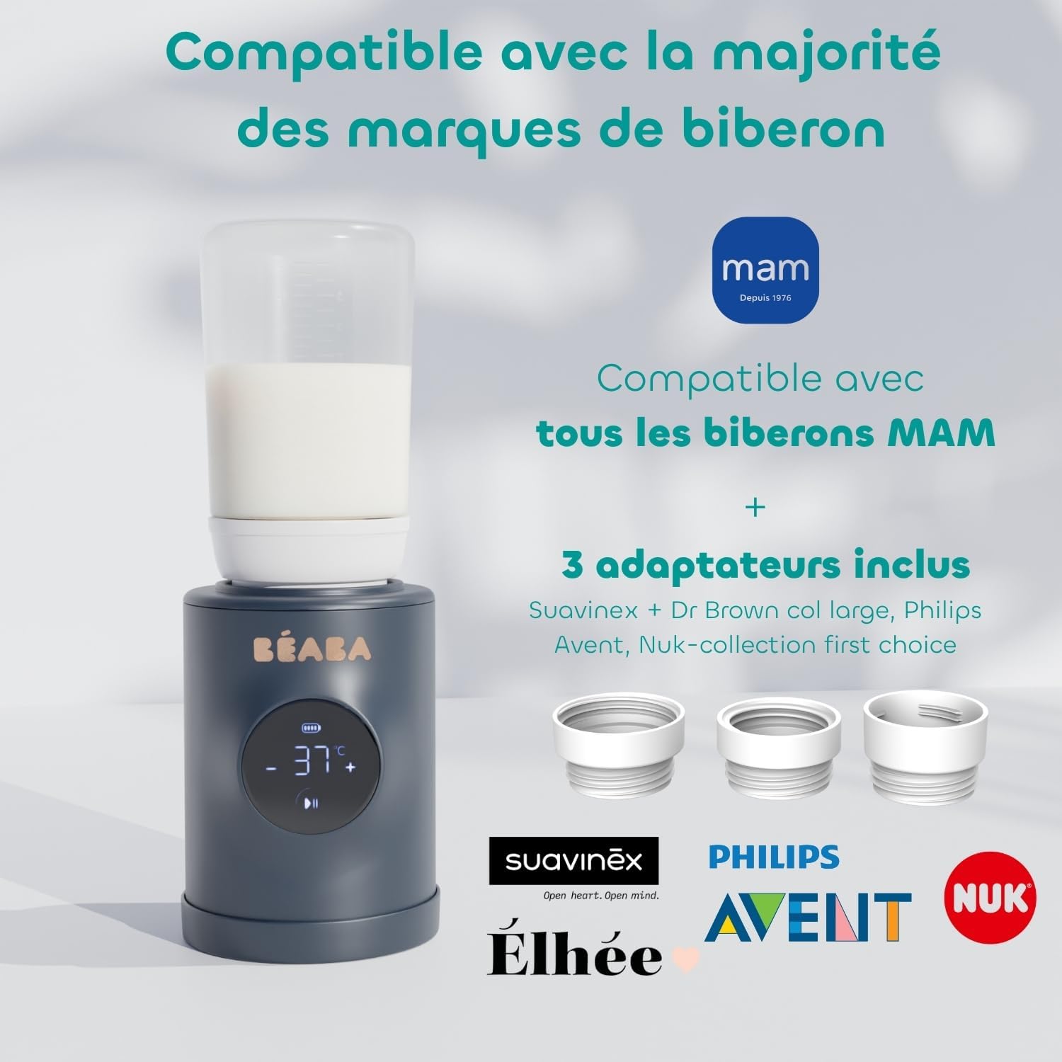 - Compatibilité avec la plupart des biberons grâce aux adaptateurs fournis.
