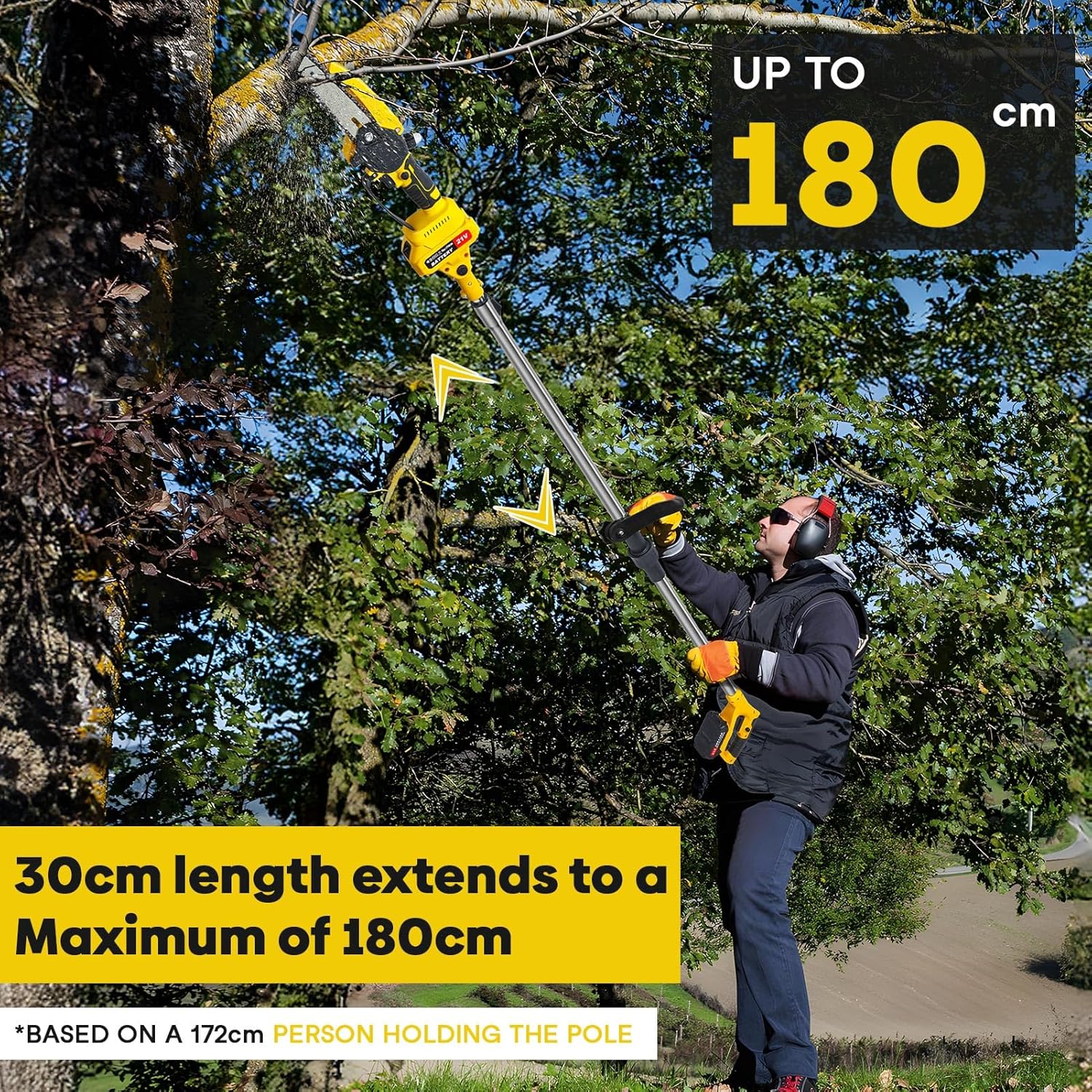 - Perche télescopique ajustable de 0,9 à 1,8 m pour atteindre facilement des branches jusqu’à 3,6 m.