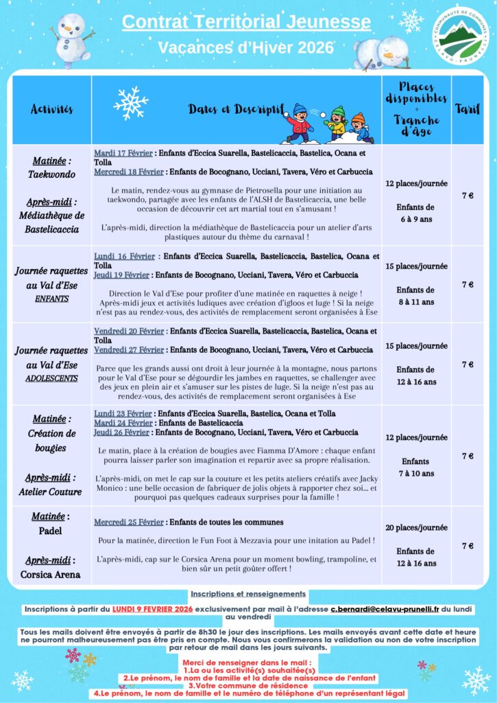 Ce programme est une initiative de la Communauté de Communes du Celavu Prunelli pour offrir des activités aux enfants pendant les vacances d’Hiver. Les informations pratiques sont disponibles à la fin du programme.