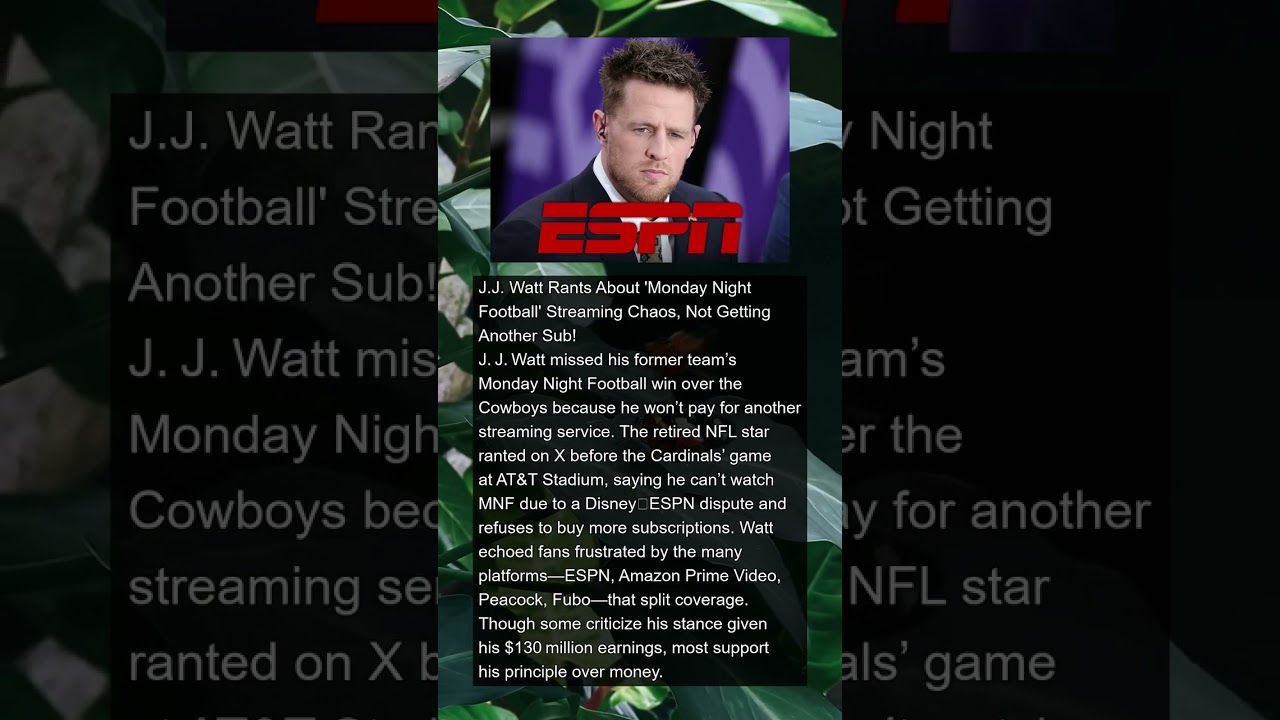 Tags : $130M earningsshorts,AT&T Stadium,Amazon Prime Video,Cardinals game,Disney ESPN dispute,ESPN,Fan frustration,Fubo,J.J. Watt,Monday Night Football,NFL retired star,Peacock,Sports streaming,Streaming Chaos,Subscription war,X rant,news