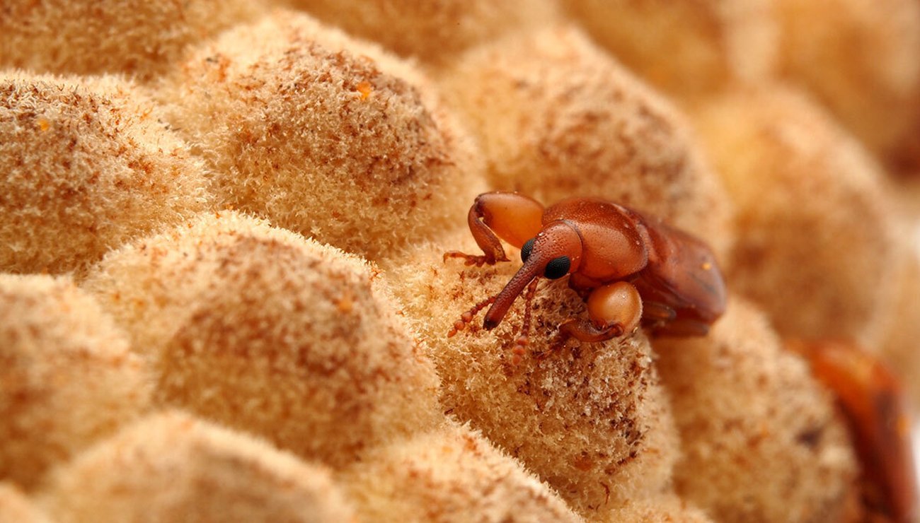 Les coléoptères de l’espèce Rhopalotria furfuracea sont attirés par la chaleur du cône femelle de la cycadale.