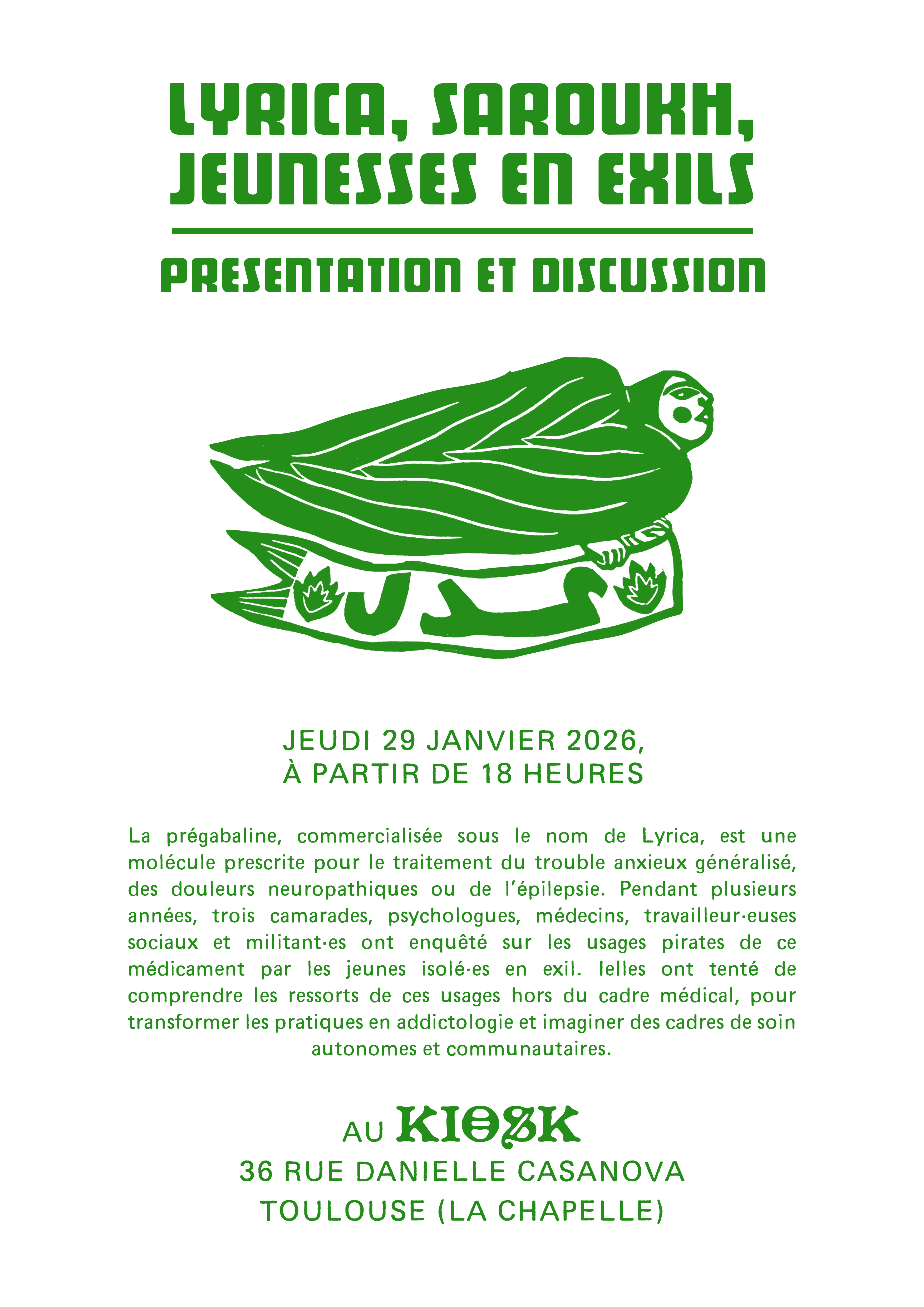 La prégabaline, commercialisée sous le nom de Lyrica, est une molécule prescrite pour le traitement du trouble anxieux généralisé, des douleurs neuropathiques ou de l’épilepsie. Pendant plusieurs années, trois camarades, psychologues, médecins, travailleur·euses sociaux et militant·es ont enquêté sur les usages pirates de ce médicament par les jeunes isolé·es en exil. Ielles ont tenté de comprendre les ressorts de ces usages hors du cadre médical, pour transformer les pratiques en addictologie et imaginer des cadres de soin autonomes et communautaires. Avec Enquête Critique, iels en font un (petit) livre imprimé cet hiver à Toulouse. Rencontre au Kiosk le jeudi 29 janvier à partir de 18 heures (à la Chapelle, 36 rue Danielle Casanova).