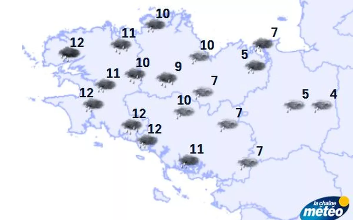 Les conditions météorologiques en Bretagne ce samedi seront marquées par un ciel couvert et de la pluie persistante. Les températures varieront entre 5 °C et 12 °C tout au long de la journée. Les départements de Côtes-d’Armor, Morbihan et Ille-et-Vilaine seront particulièrement touchés par des rafales de vent pouvant atteindre 70 km/h.