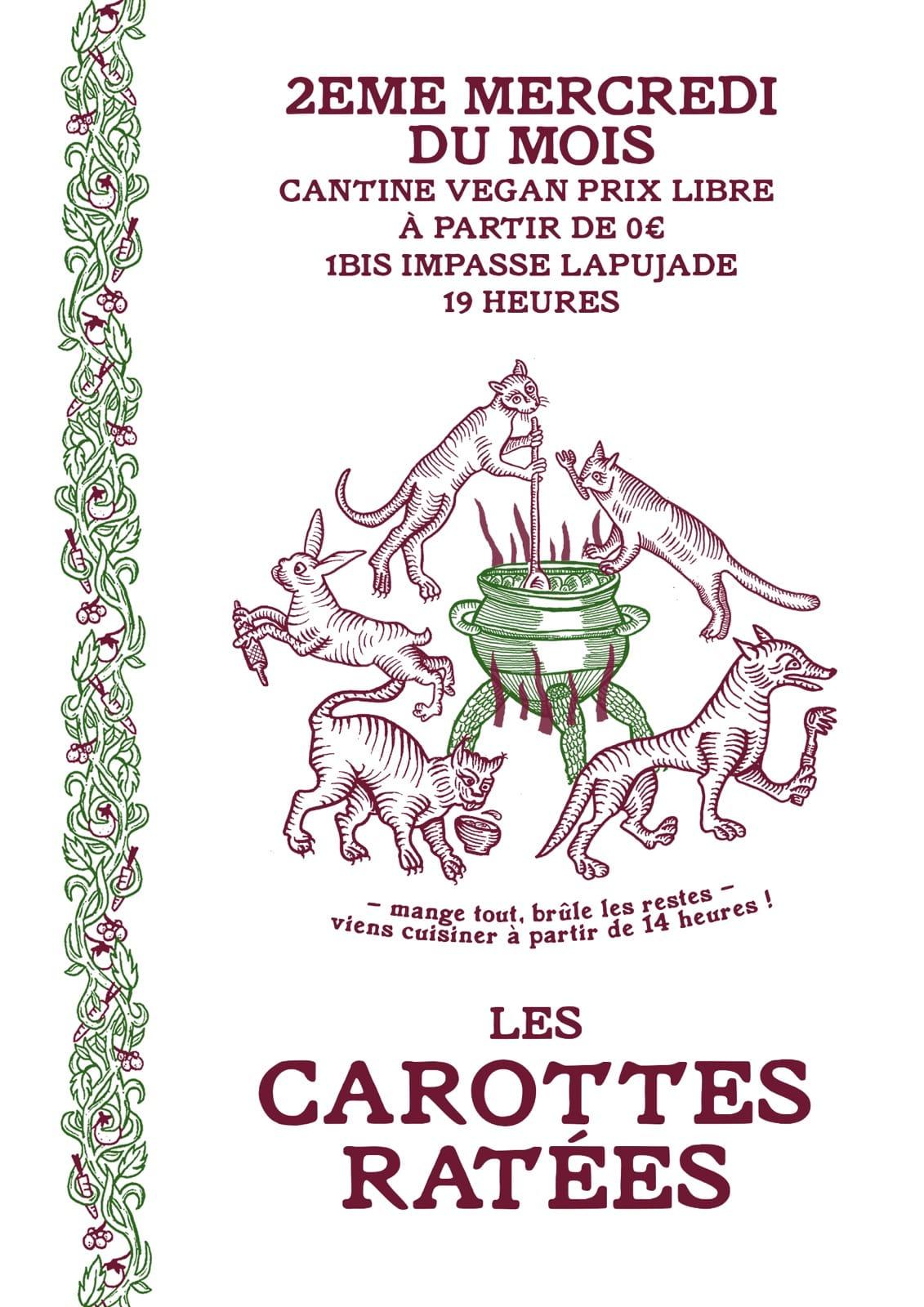 Ce mercredi, l’Impasse organise sa cantine mensuelle. C’est une occasion de se retrouver autour d’un repas vegan, à prix libre, et même gratuit. Si vous souhaitez participer, vous pouvez venir cuisiner dès 14h. Sinon, le repas commence à 19h au 1 impasse Lapujade.