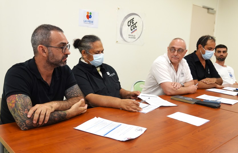 Nicolas Labenski (Fédé), Sonia Kabar (Fédé), Emmanuel Soria (UT-CFE-CGC), Michaël Crépin (UT-CFE-CGC) et Yannick Roudaut (SIASU) ont animé une conférence de presse, ce vendredi 12 décembre, au Médipôle. Photo Anthony Tejero