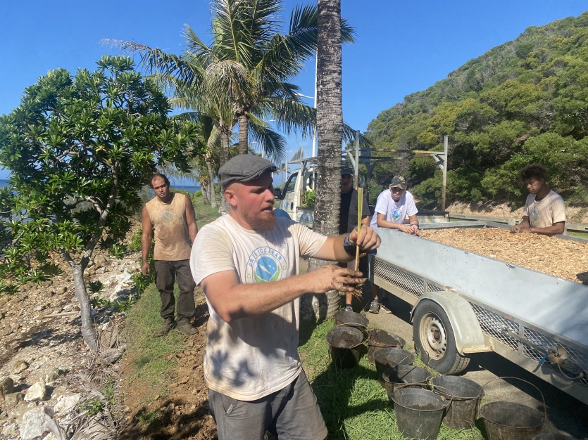 Le travail est organisé en deux temps. D’abord une ligne de vétiver à disposer sur le haut du talus. Ensuite, des plantations plus bas, au plus près du bord de mer. Les trous ont déjà été préparés par l’équipe de Caledoclean. Il ne reste plus qu’à planter, tasser, puis pailler. « L’idée, c’est d’avancer ensemble », résume Thibaut Bizien en détaillant avec précision les gestes à effectuer.
