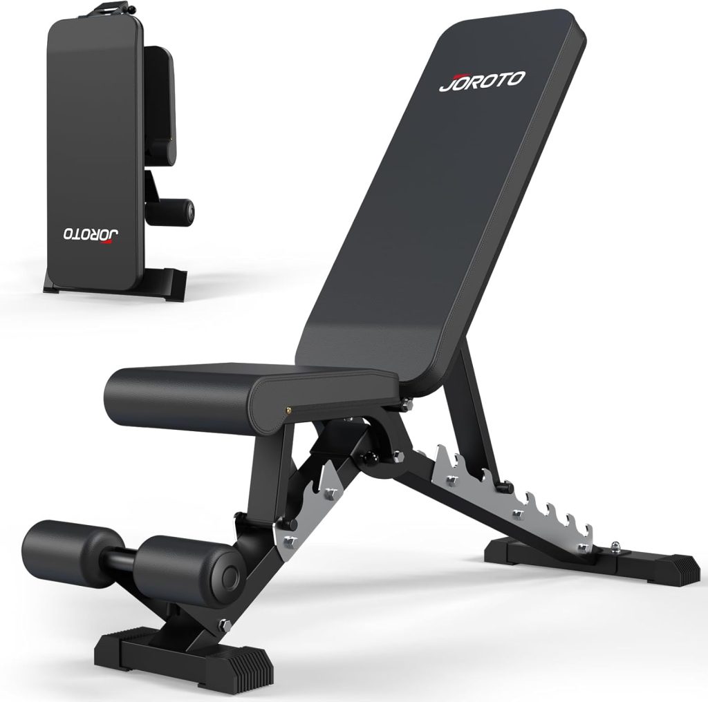 • JOROTO Banc de musculation réglable – Charge de 317,5 kg/362,9 kg/453,6 kg – Banc d’entraînement pliable pour entraînement complet du corps