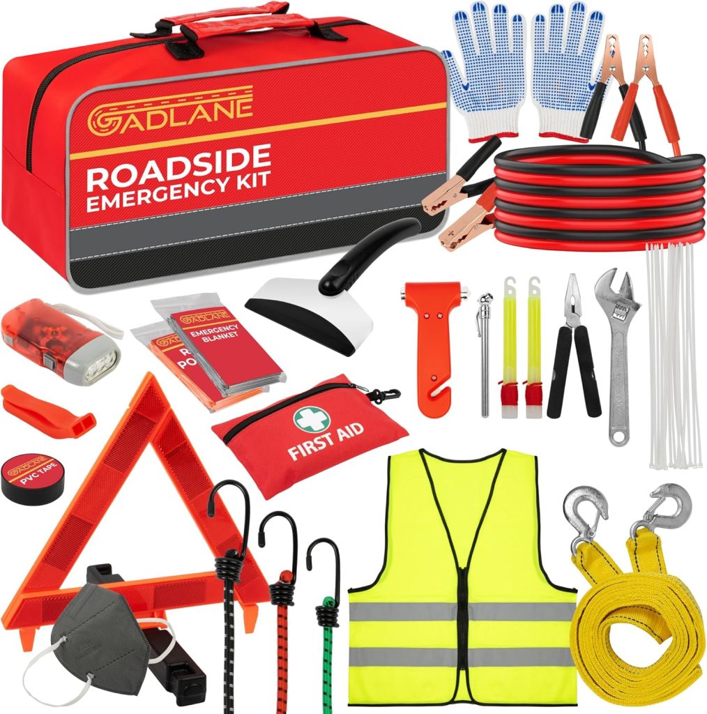 Kit d’urgence pour Voiture – Kit de dépannage pour Auto Extra Large avec Triangle d’avertissement, Corde de remorquage, Trousse de Premiers Secours, Marteau de sécurité et étui de Rangement