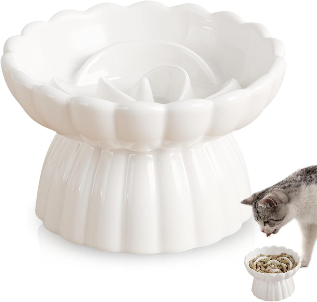 Bol en céramique anti-glouton pour chat surélevé, bol anti-glouton pour chat, bol à alimentation lente pour chat, pour chats et petits chiens – Blanc, 14 x 8,5 cm