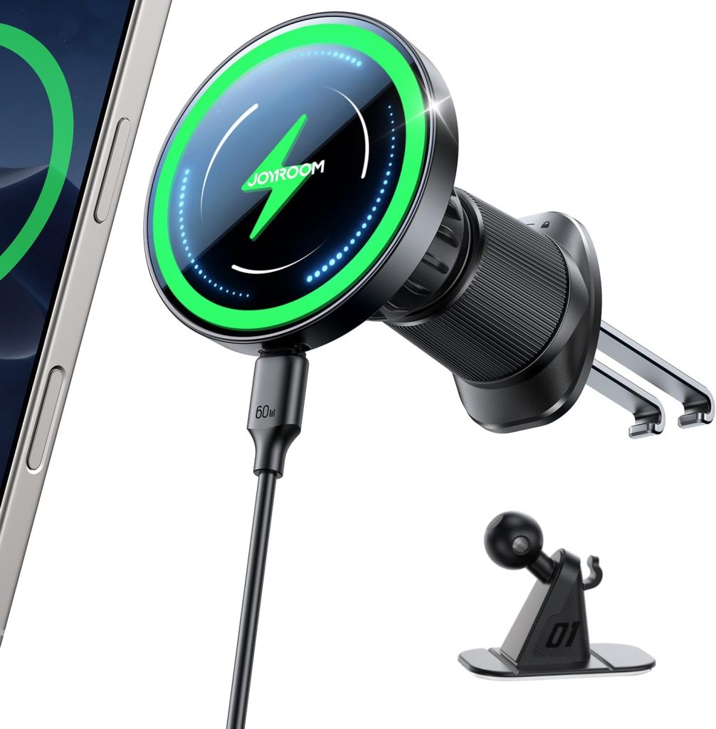 • JOYROOM Support Telephone Voiture Magsafe Induction Ensemble 2 en 1 [Conception Améliorée Pince Double Crochet] Chargeur Magsafe Voiture 15W, Chargeur Induction Voiture iPhone 17 Air Pro Max 16-12