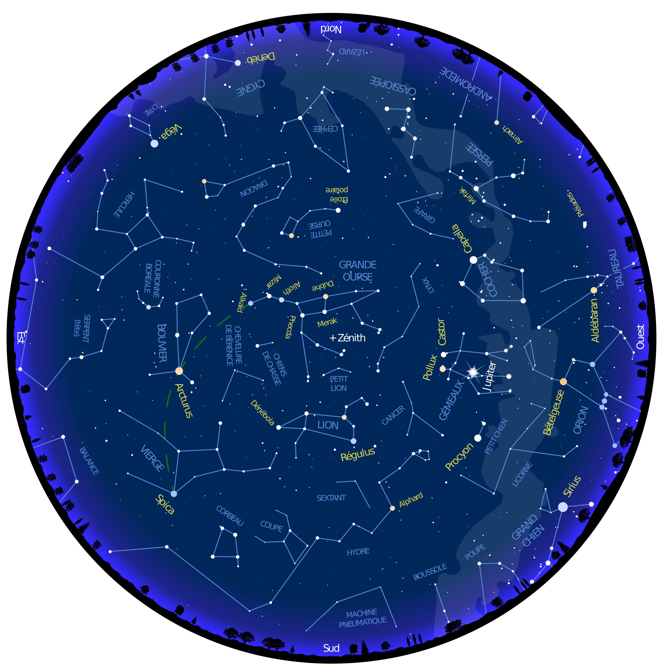 Découvrez ci-dessous la carte du ciel visible à la mi-avril vers 21h (cliquez dessus pour agrandir l’image).