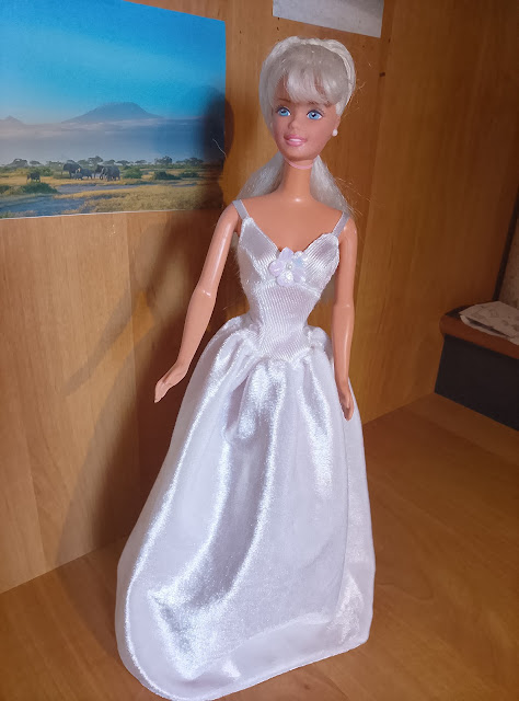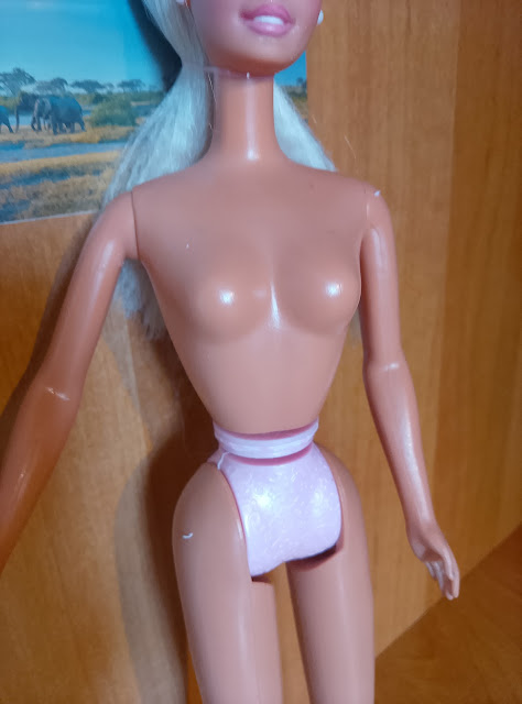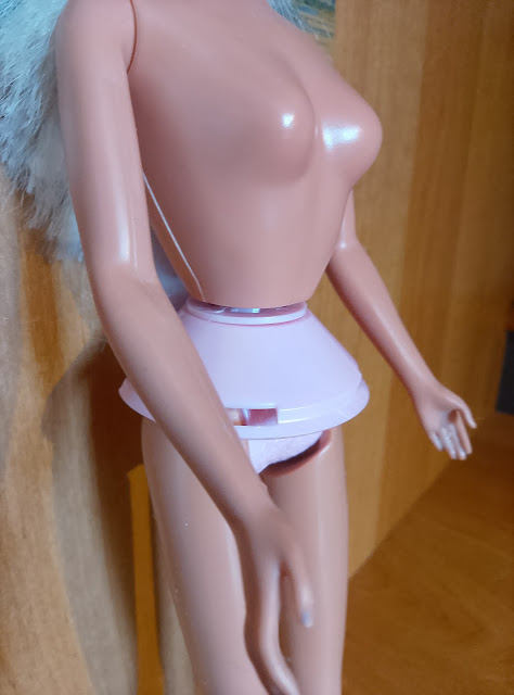 Une fois la jupe en tissu décousue, il reste encore cette pièce en plastique dur, qui tourne autour de la taille, et empêche de lui mettre d’autres tenues 😔