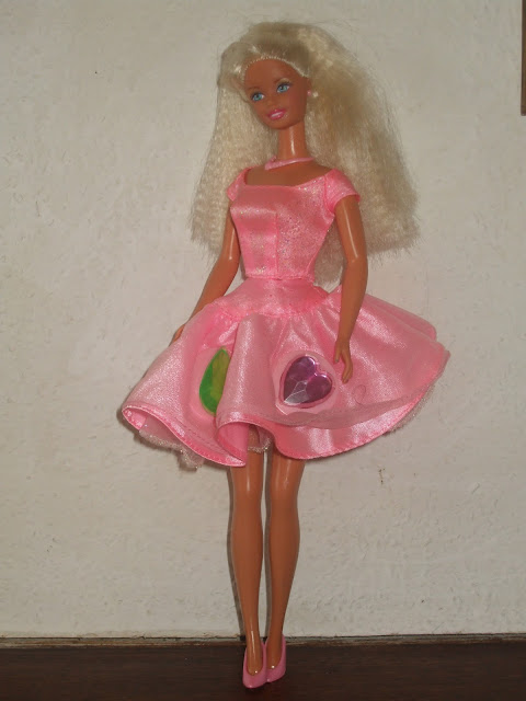 La jupe est inamovible, alors quand elle a servi, que les compacts ont perdu leurs couvercles-bijoux, qu’elle est tâchée, la poupée n’est plus très présentable 😕